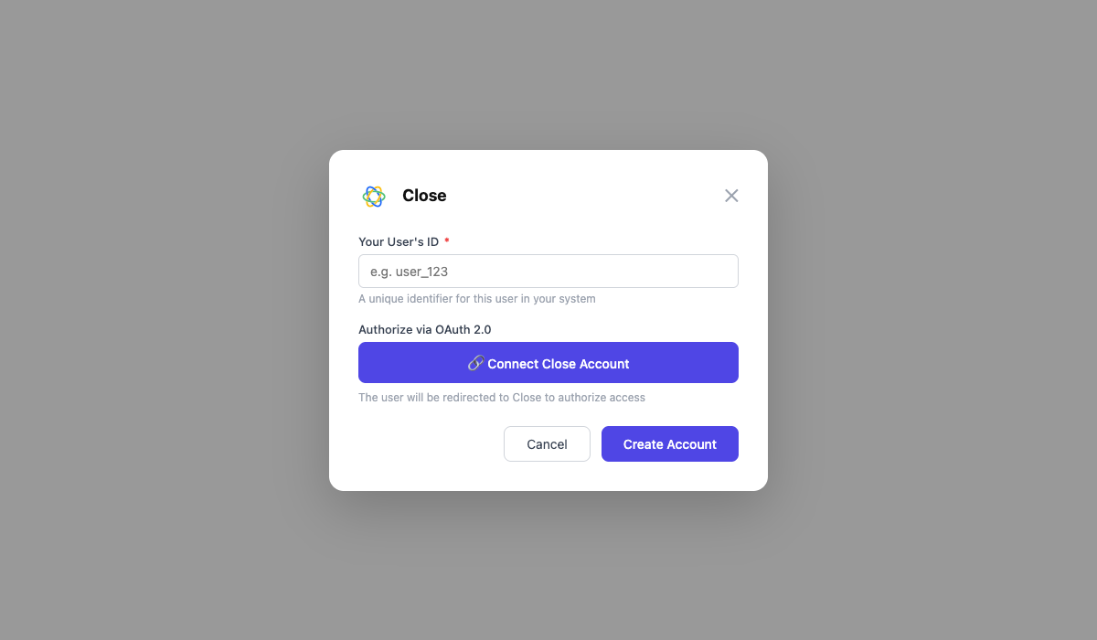 - Enter a User ID and click Save. You will be redirected to Close to authorize access.
