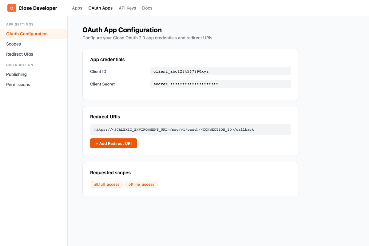 You supply your Close Connected App credentials (Client ID + Secret) once per environment in the Scalekit dashboard.